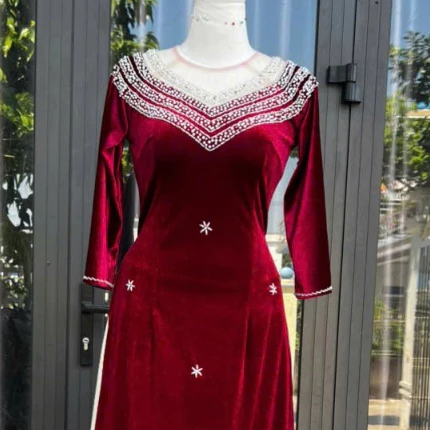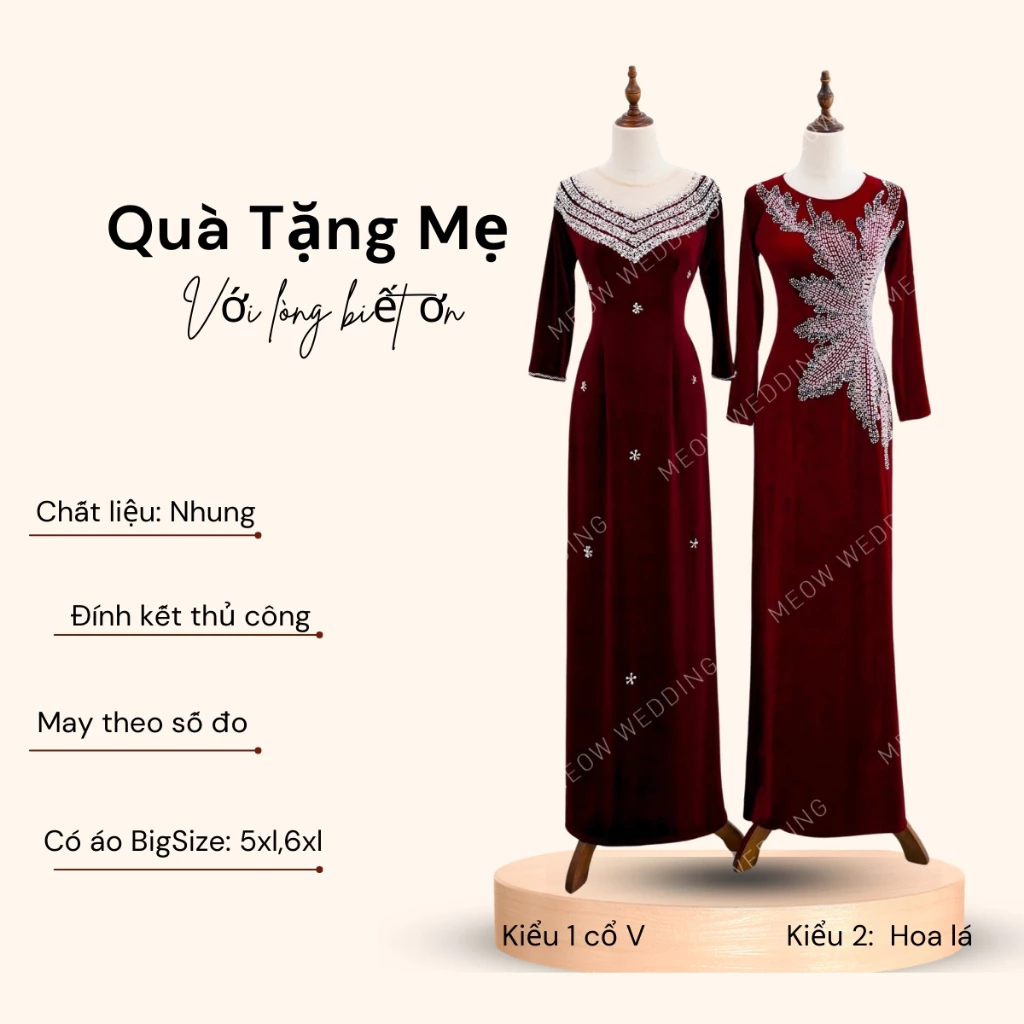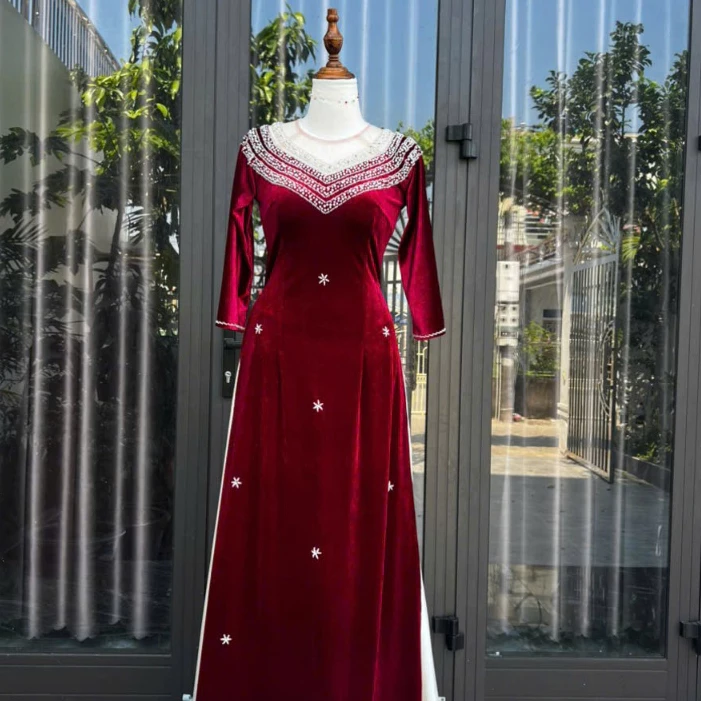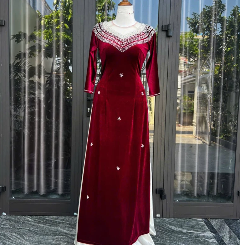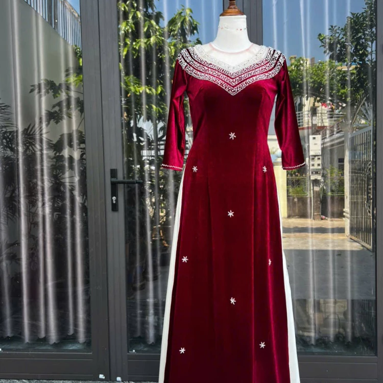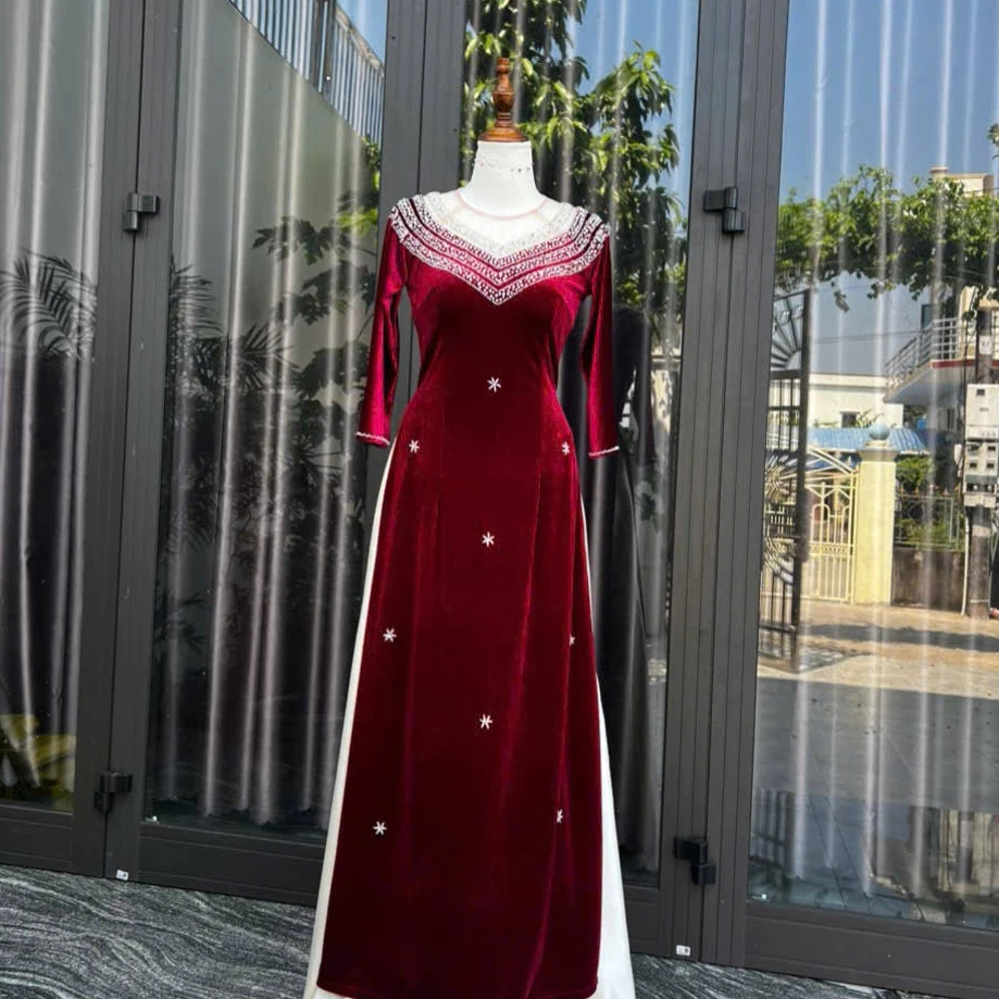 Áo dài bà sui chất liệu nhung cao cấp màu đỏ đô dành cho các mẹ ngồi sui ADM09