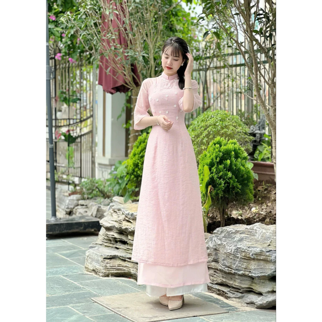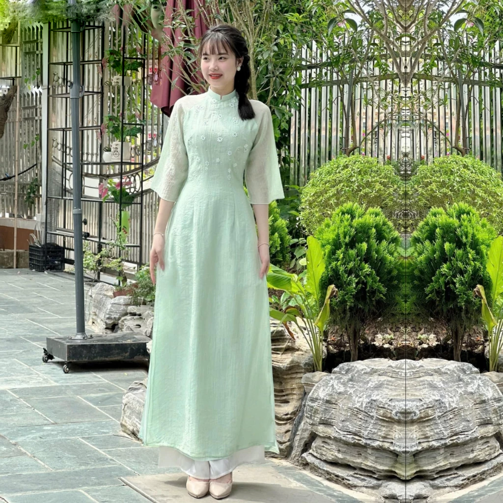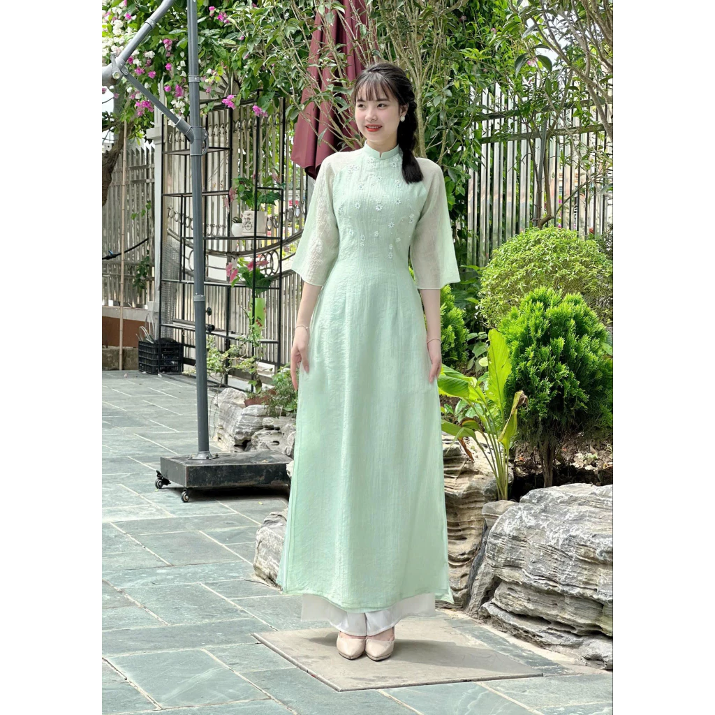 Áo dài cách tân chất liệu đũi mềm phối hoa kiểu cổ truyền thống ADT08