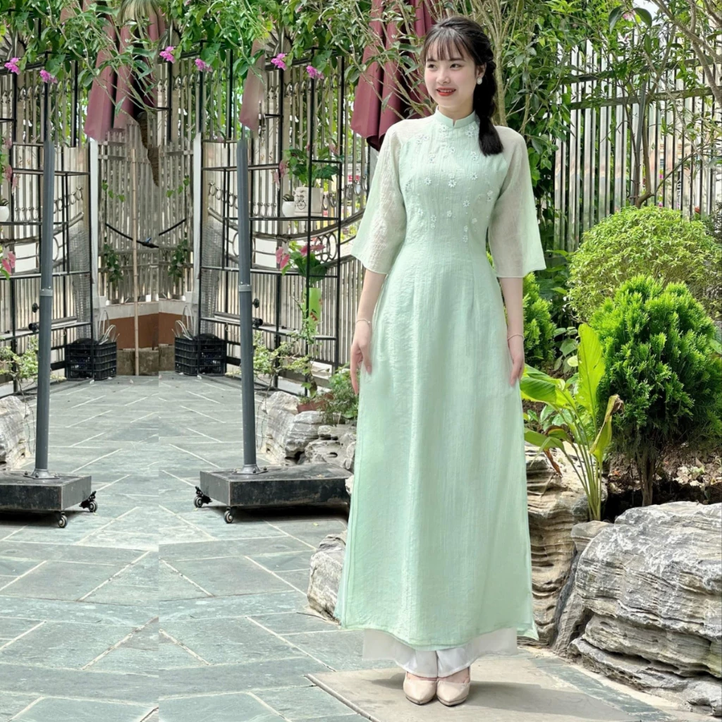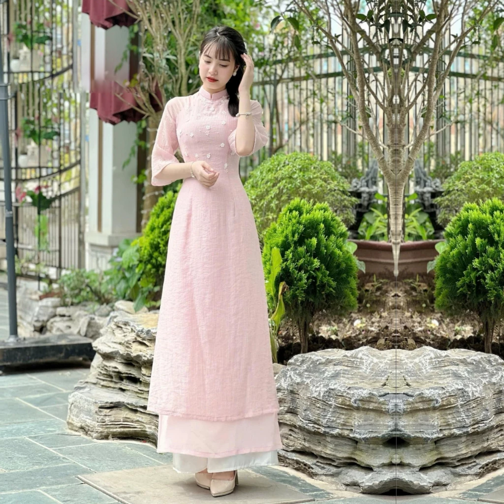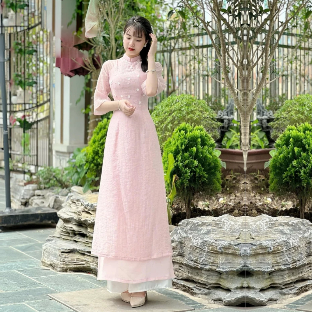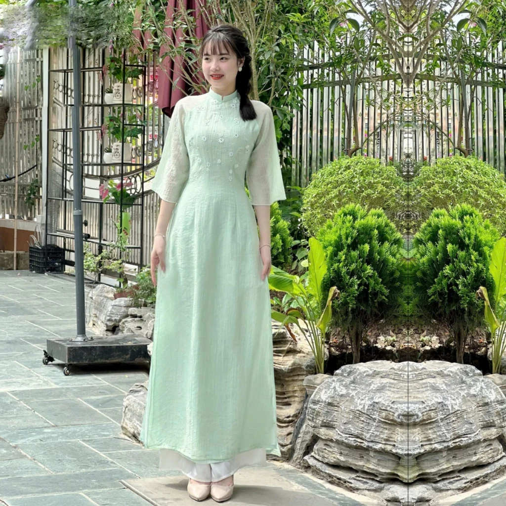 Áo dài cách tân chất liệu đũi mềm phối hoa kiểu cổ truyền thống ADT08